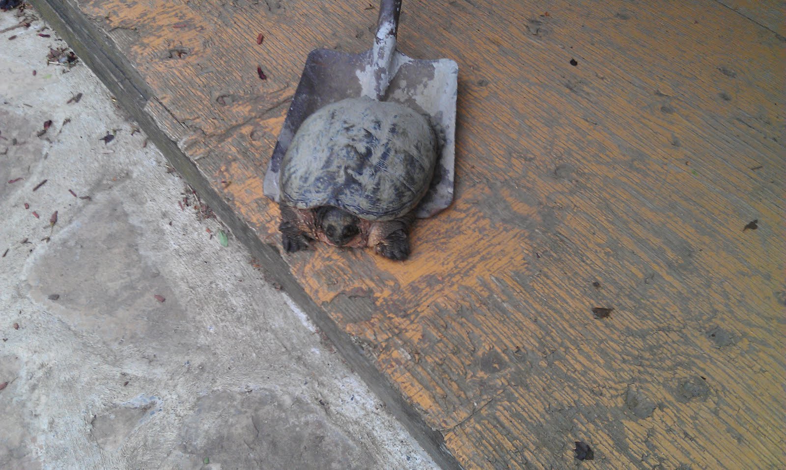 You might think that this was the end of the story, I did – that was until I went to step out the front door about an hour later and there was miss personality, on my porch, glaring up at me from the door mat. Now, if I was the type I’d almost say she had taken it personally and had come to get me, maybe she was just there to ask directions - whichever. Since the shovel idea worked so well for me the first time I called for reinforcements to deal with the 'killer' turtle. Number 1 son was clear that the turtle had no beef with him. She was my problem and perhaps I should just sleep with one eye open from now on (I'll remember that in my will). Number two son , Mr. Naturalist, eager to see the ornery old dame (the turtle, not his mom) came to my rescue. After taking a number of photos of the lady with attitude he managed to convince her to take a shovel ride to a more turtle friendly spot away from the house.