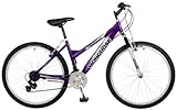 Mongoose Montana Women's Mountain BikeEquipped with a smooth-riding front-suspension fork, the Mongoose Montana women's mountain bike is a great choice for both trail and street riding. The bike features a handcrafted, high-tensile-strength aluminum frame that holds up durably to rough handling. The index 21-speed SRAM MRX shifters, meanwhile, provide plenty of control whether you're on flat or hilly terrain. Finally, the bike's extra-wide 1.95-inch tires roll smoothly over pavement, grass, or dirt. Other features include front and rear linear pull brakes, an adjustable quick-release seat, a three-piece ATB crank, 26-inch wheels with alloy frames, and a rust-resistant powder coating. The Montana carries a one-year warranty. Read more